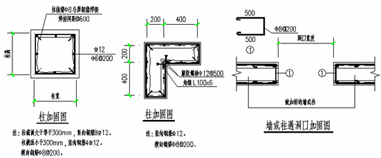 ①剪力墙:喷射砼扩大截面加固;