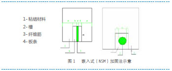 将纤维束用机械嵌入构件表面一定深度,再用特定胶黏剂将纤维束与构件融为一体共同受力,达到加固补强的目的。通常做法是,在待加固构件的表面剔出V 形或U 形槽,在槽内先注入约1/2 深度的粘结材料,将纤维筋或板条放入槽中并轻压,静置一定时间使粘结材料充分包裹侵润,再在槽内注满粘结材料并将其表面修复平整,如下图所示。与外粘贴型加固方法相比,嵌入法除同样具有高强,高效,耐腐蚀等诸多优点外,还有以下几个方面的优势