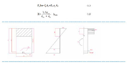 对于单筋矩形截面,若不考虑二次受力影响,当破坏模式是混凝土被压碎控制时,由下图平截面假定、力平衡关系可以得到下式(1)(2)。其中为不考虑粘结失效破坏时纤维拉应变。当计算所得大于FRP 的设计极限拉应变时,对应破坏模式为FRP 被拉断,采取Ef 等于FRP 的抗拉强度设计值,即ffd。